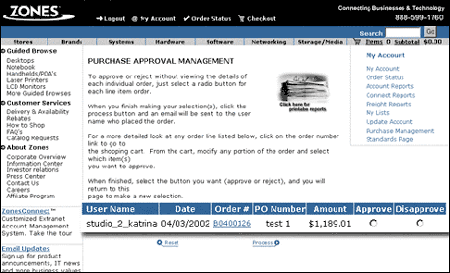 Integrate your company's approval process online. The Purchase Management feature lets you customize your online approval process to meet your companies specific purchasing needs. You can set up multilevel approval structures within the divisions or branch offices of your organization, so everyone follows procedure and stays informed. And because ZonesConnect is Web-based and free of cost, there is no software to install and no overhead to maintain.