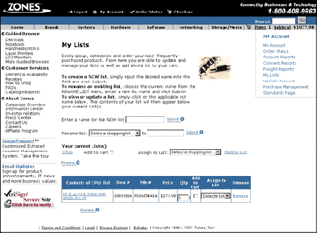 The simple interface lets you group, categorize and reorder the products you require. You simply set up lists and add products to the appropriate list as you browse. Each time you log into your ZonesConnect site, your list will include the items you previously saved. When you are ready to reorder, one click adds individual items or the entire list to your cart, so checking out is fast and easy. |